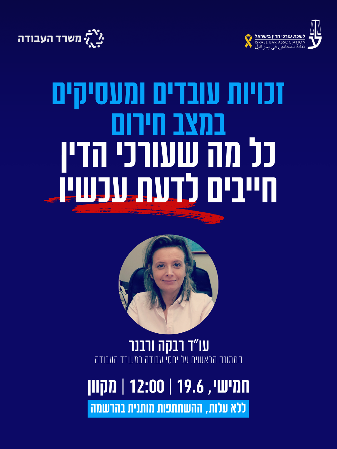 לשכת עורכי הדין בשיתוף משרד העבודה מזמינה את ציבור עורכות ועורכי הדין לוובינר מקצועי ומעמיק בנושא דיני עבודה במצבי חירום.