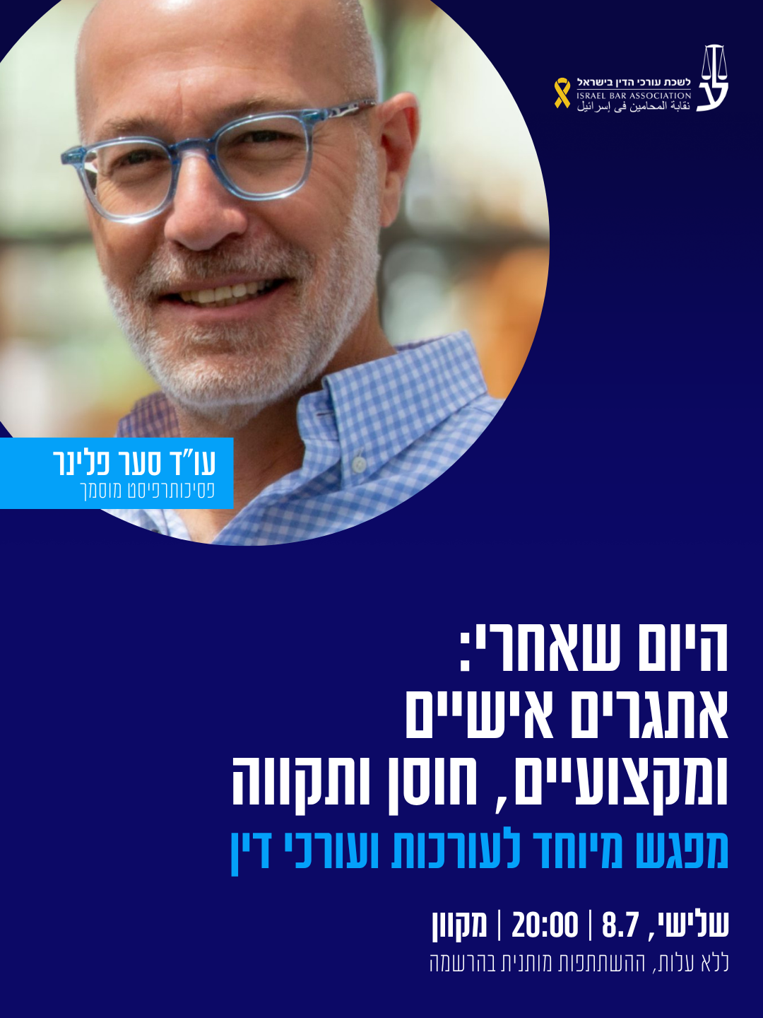 לשכת עורכי הדין מזמינה אתכם למפגש זום מיוחד, שיח פתוח, כן ואמיתי, בהובלת עו״ד סער פלינר – פסיכותרפיסט מוסמך בכובע אחד, ובכובעו השני – שותף במשרד גולדפרב גרוס זליגמן, ראש תחום ליטיגציית קניין רוחני, רישום זכויות ודיני בידור.